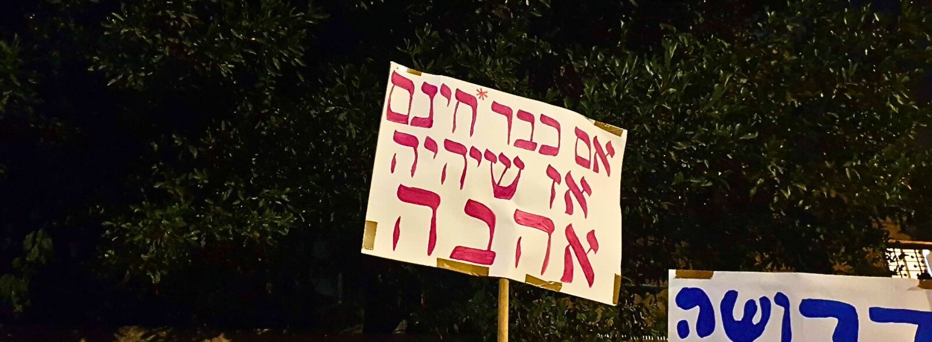 אחד הדברים היפים שהיו במחאת בלפור היה הגיוון בשפה. בין השלטים המוחים והזועמים, אפשר היה לראות גם שלל שלטים הומוריסטים ומלאי תקווה: "אם כבר חינם אז שתהיה אהבה", "ואהבת לעמך כמוך" או "אוחנה אתה צריך חיבוק?", אולם במציאות הישראלית הקשוחה הקיטוב הולך ומתגבר, וחווית האחווה מתחלפת בחוויית האחרות.